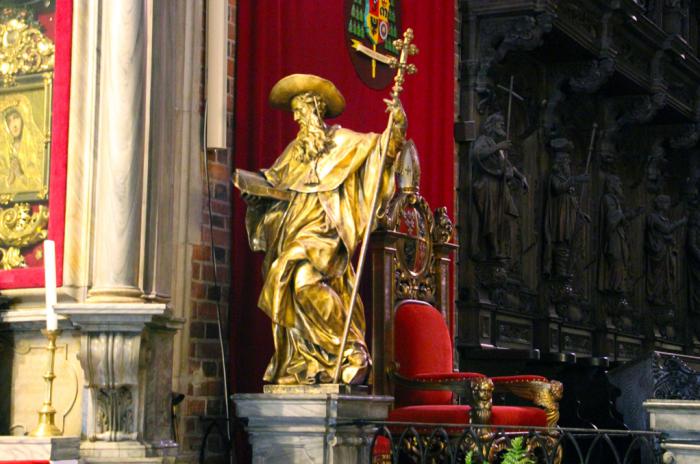 И ещё одна примечательная деталь, у ног святого расположились ангелы, все пухлые, кучерявые, кроме одного, совершенно лысого. Согласно городской легенды, фигуры херувимов изготавливал ученик по поручению скульптора Ежи Урбанского, закончившего основные работы. Находясь вне себя от радости от полученного задания и недавно родившегося ребёнка, ученик решил увековечить наследника в скульптуре. Обнаружив на следующий день безволосую головку ангела среди множества кудрявых, рассерженный мастер выгнал ученика с работы. Только мольба его супруги, пришедшей к скульптору с просьбой о прощении легкомысленного мужа с младенцем на руках, растопили гнев мастера и он принял ученика обратно. Уж не знаю, насколько правдива эта история, но лысая головёнка на скульптуре присутствует: