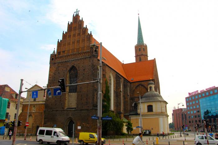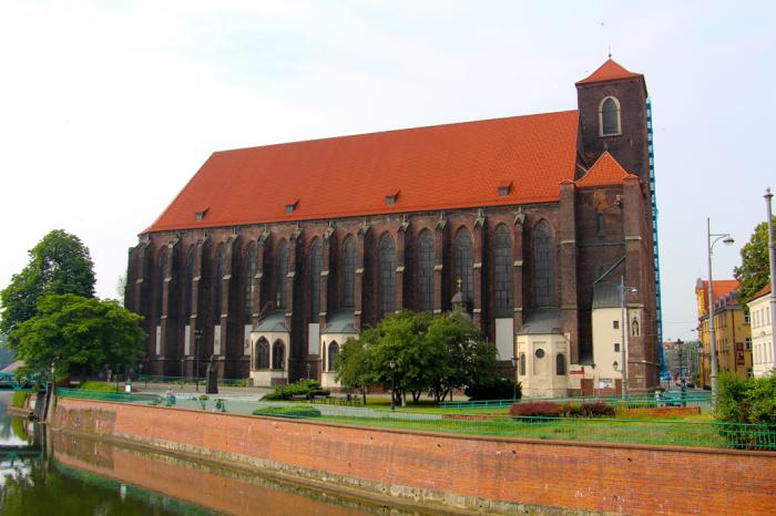 Полная противоположность ему – угрюмая готика собора, который ещё называют как костел Божией Матери на песке (Kościół Najświętszej Maryi Panny na Piasku). Построили его в XIV веке на месте старой кладбищенской часовни. Как и его визави, во время войны сильно пострадал и восстанавливался православной церковью. У его северной стороны установлен памятник кардиналу Болеславу Коминеку, бывшему Вроцлавскому архиепископу: