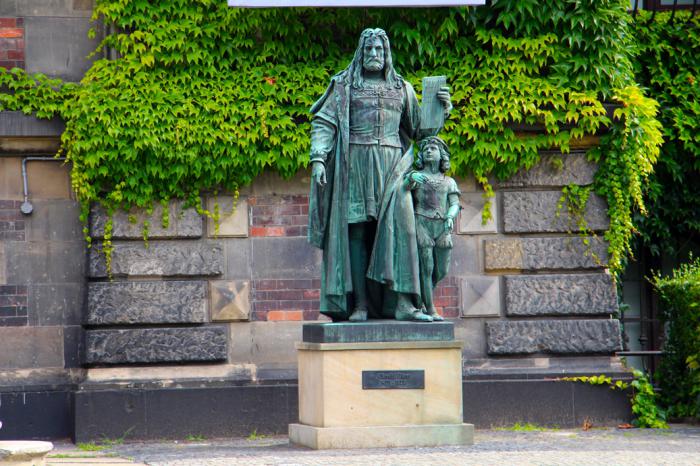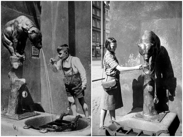 Долгое время на Рыночной площади находился его предшественник, с прикреплённой к ноге кружкой и выполнявший роль питьевой колонки…