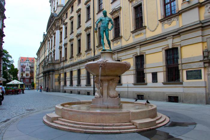 На площади перед университетом, которая так и называется plac Uniwersytecki, установлен фонтан немецкого скульптора Хуго Ледерера, называемый в народе «Фехтовальщик»: