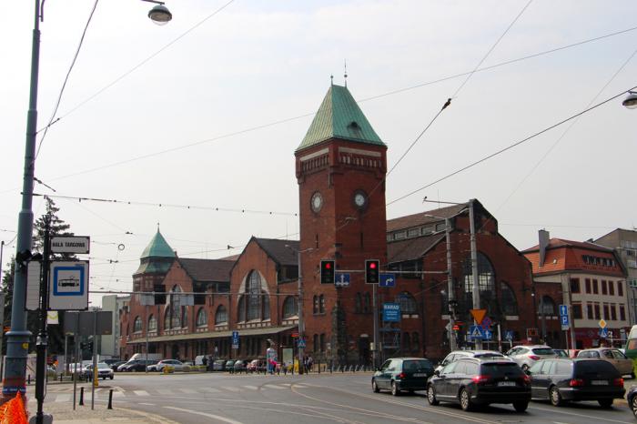 По другую сторону перекрёстка огромный зал Hala Targowa, по сути — крытого рынка, больше похожего на железнодорожный вокзал. Вон и башня с часами имеется: