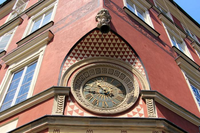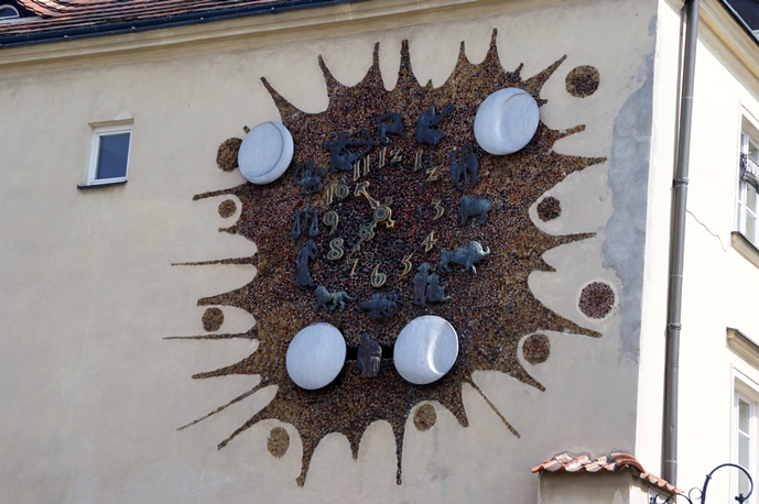 С ярмарки вышли к улице Piekarska, заметили на фасаде дОма оригинальные, с претензией видимо называться «астрономическими», часы: