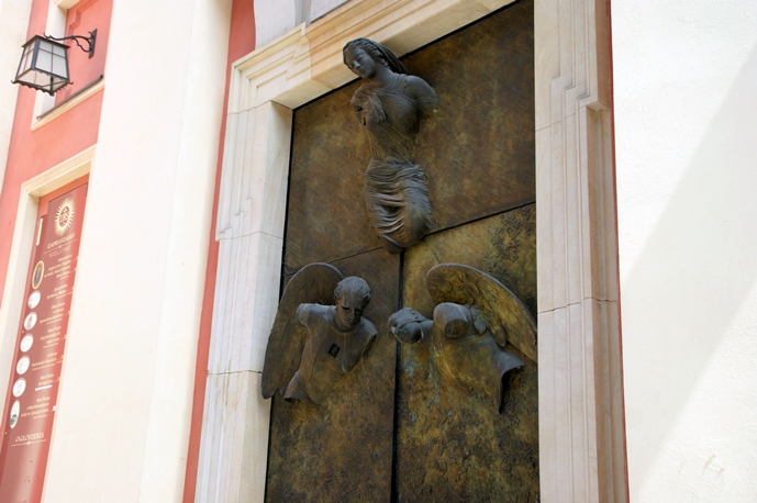 Прошу прощения — я отвлёкся. Костёл Милостивой Божьей Матери (Kościół Matki Bożej Łaskawej), принадлежащий ордену Иезуитов, находится по «правую руку» от собора. Построенный в 1600-х годах, в отличие от «соседа» выполнен в стиле барокко. Нас он сразу привлёк входными дверями, на которых расположены барельефы Божьей Матери и ангелов. Скажу сразу, что глядящие на прихожан пустыми глазницами святые производят, честно говоря, жутковатое впечатление. Во всяком случае в этом мнении мы с Власом сошлись не сговариваясь. Судите сами: