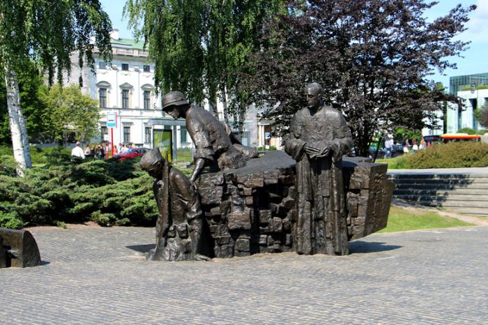 От совы мы пошли вверх на plas Krasinskich. На площади расположен монумент, посвящённый варшавскому восстанию 1944 года. Монумент состоит из двух композиций. На одной — группа восставших Армии Крайовой защищает баррикады…