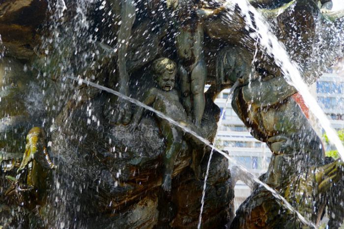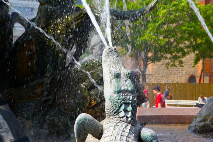 Расположен он между двумя вышеупомянутыми реликвиями — церковью и ратушей. Над фонтаном возвышается могучая фигура Нептуна, сидящего на чаше, держащуюся на мощных руках мифических тритонов, в окружении четырёх женских фигур, которые олицетворяют великие европейские реки — Рейн, Одер, Эльбу и Вислу. Ну наличие первых трёх в этом списке я понимаю, а вот как сюда попала польская Висла? Я сделал вывод, что истоки идут с времён тевтонцев и пруссов, когда они владели частью польских земель. Кроме этих фигур в скульптурной композиции фонтана присутствует множество других — ангелы, черепахи, крокодилы и другие обитатели морской стихии. Вокруг фонтана, учитывая солнечную погоду, расположилось множество желающих и остудиться в прохладе извергающихся водных струй, и сфотографироваться.