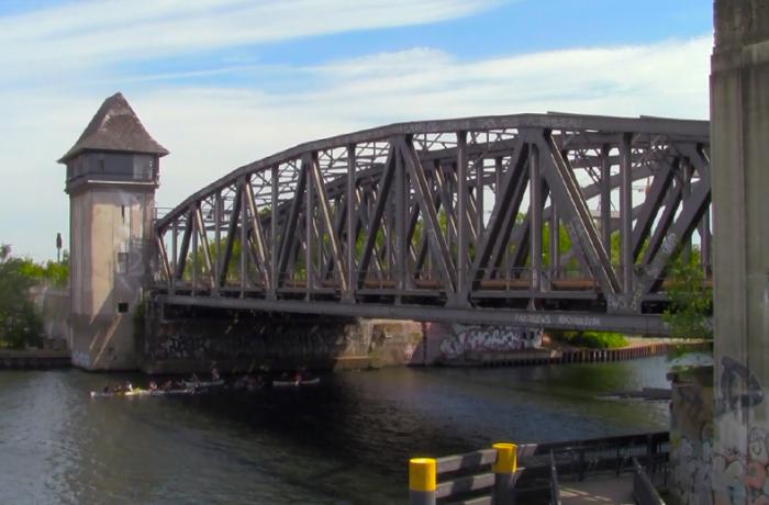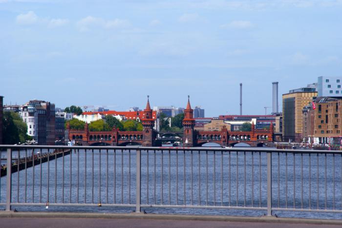 Вид на мост Oberbaumbrücke, построенный в конце XIX века, взамен старого деревянного моста, служившего «водными воротами» города и на котором работала берлинская таможня: