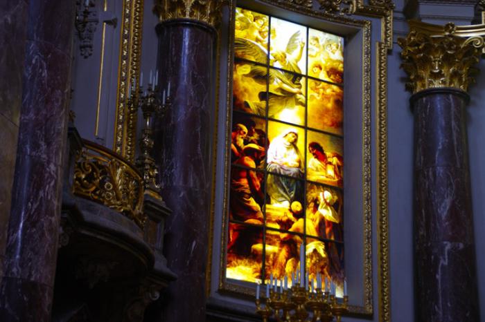 Хотел бы только заметить, что Исаакиевский собор в Питере нельзя назвать типичным православным храмом. Он строился в классическом европейском стиле, с нарушением ряда канонов и совершенно нетипичным для православных церквей витражным окном. Так что, если храм в Берлине напомнил Вам Исаакиевский собор, — это вполне логично. :)