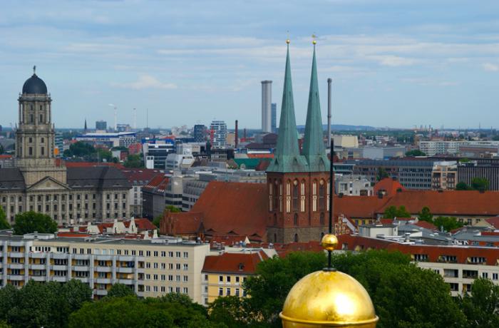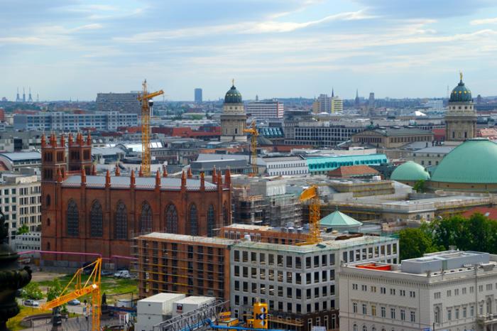Вид на площадь Gendarmenmarkt (на переднем плане кирпичная неоготическая церковь Friedrichswerder):