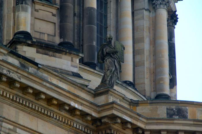 Собор действительно производит впечатление своей монументальностью. И совсем не похож на типично католическую церковь — больше на православную, чем-то, мне показалось, похож на питерский «Исаакий». Но красив, этого не отнять! Красоту строения подчёркивает парк Люстгартен с фонтаном посередине, разбитый перед собором. На этой же парковой площади, справа от собора, находится неоклассическое здание старого королевского музея: