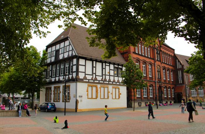 Здание гимназии — Ratsgymnasium (второе название — Grest'sche Hof, но я так и не сумел перевести, что это за двор). История этого учебного заведения пишется с конца XIII века. Как с течением времени менялась система образования, так-же менялся и архитектурный стиль здания. На сегодняшний день оно выглядит так: