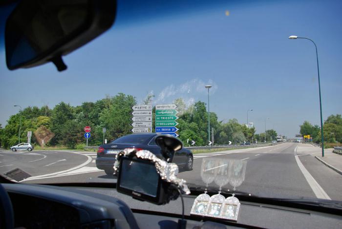 В Трэвизо, на перекрестке от незамеченного «полицейского» встряхнуло и от навигатора отскочил шнур питания, через несколько секунд он отключился, это как-то заложено в настройках энергосбережения навигационной программы. Пока перегружал навигатор, пришлось ездить по кругу (на круговом перекрестке). Через пять кругов навигатор таки перезагрузился и показал в каком направлении выехать. Почувствовал, как немного закружилась голова. Эффект карусели! …и с небольшой скоростью-то двигался….