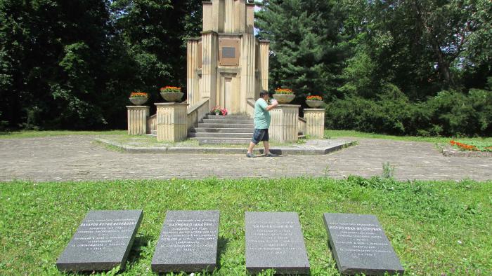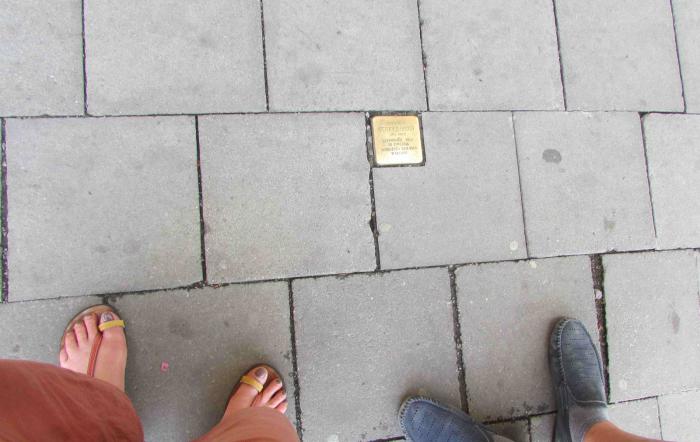 Табличка в асфальте — такие по всему городу, на них имена тех, кто погиб в концлагерх, как мы поняли…