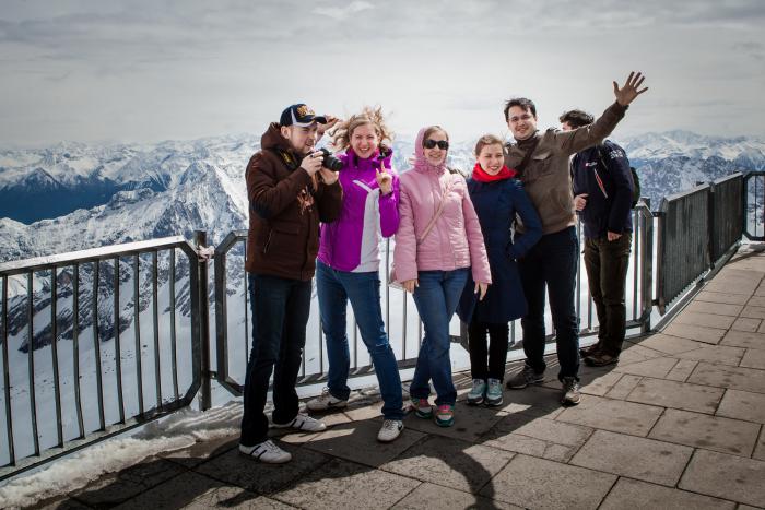 Ну а на самом верху красотища невероятная!!! Высота, кругом только макушки гор видны. Ребята сказали, что виды будто из самолета ( я не летала, не знаю). Но виды завораживали и пленяли так, что уходить оттуда не хотелось долгое время. По поводу одежды- мы были в куртках и шарфиках, т.к все же на такой высоте довольно сильный ветер. Если замерзли, то можно погреться в кафе и неплохо перекусить там.
