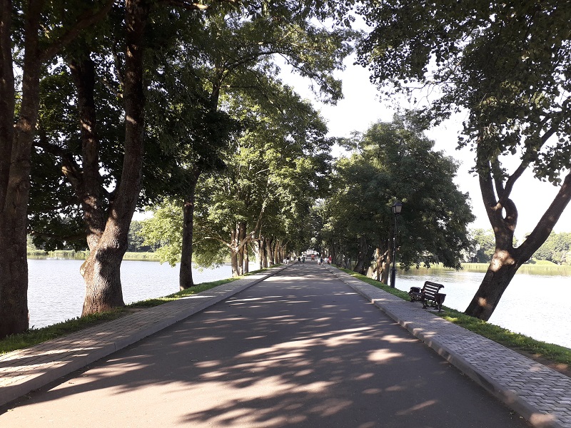 Пройдя мимо замка и парка Антония, я в гордом одиночестве прогулялся по Замковой улице, омываемой с обеих сторон Замковым озером, осматривать Костёл Тела Господня: