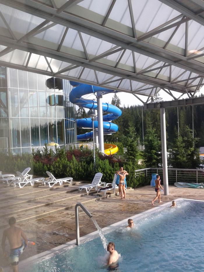 Следующие термы, которые мы посетили были Эти термы построены сравнительно недавно. Ориентированы в большей степени на молодежь и детей. Хорошие детские горки, много бассейнов. Но для нас было все же шумновато. Так же была некоторая проблема с джакузи зонами, так как они работали непрерывно, посетители места освобождали крайне долго, а просто стоять и «ловить» место не очень то и хочется, те более нас было трое. По стоимости, мы ходили в акционное время, если покупаешь билет с 13.00 до 15.30, то стоимость билета на 3 часа на человека составит 49 zl (808 руб), на целый день билет стоит 105 zl (1 732 руб). Красиво, интересно, много всего, но не для нас, поэтому посетили мы данные термы только один раз и потом все время ходили только в Термы Буковина. Пара фоток:
