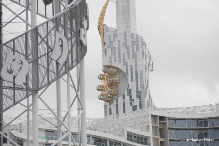 Вид из окна гостиницы на архитектурную загогулину.