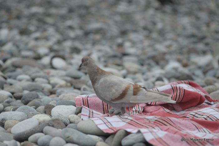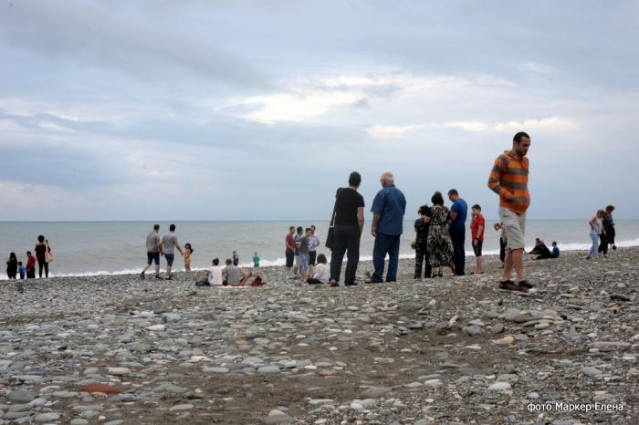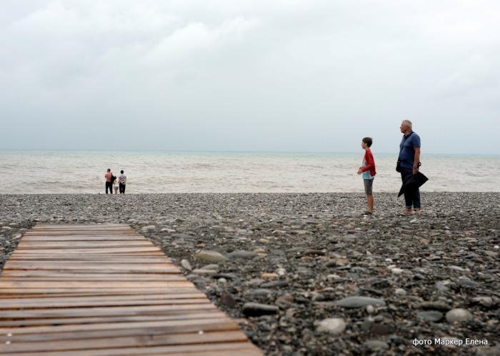 На пляже всегда много людей (даже если погода плохая), смотрят на море, камушки кидают.