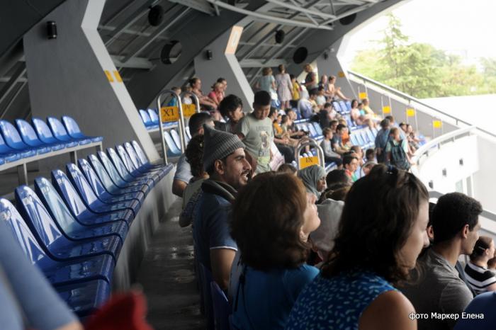 На фото — многонациональная толпа заполняет зрительские ряды.