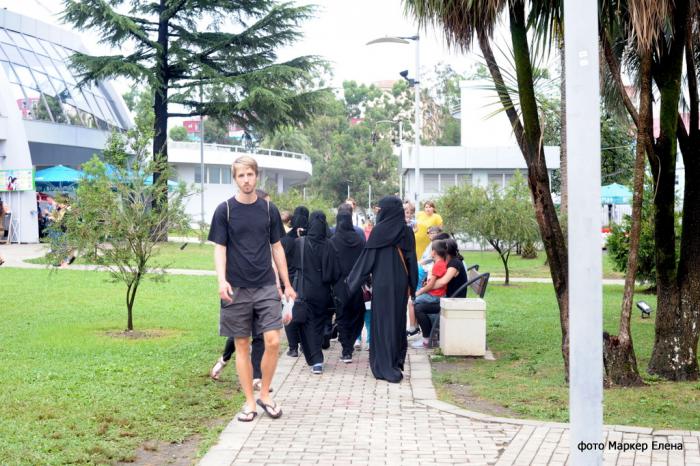 Я уже писала, что в Батуми летом кого только не встретишь – русские, украинцы, турки, прибалты, братья- славяне из Европы и … много много арабов. Большинство женщин в черных балахонах и никабах ( это когда только прорезь для глаз). При этом муж и дети одеты вполне по европейски — в шорты и майки ярких цветов.