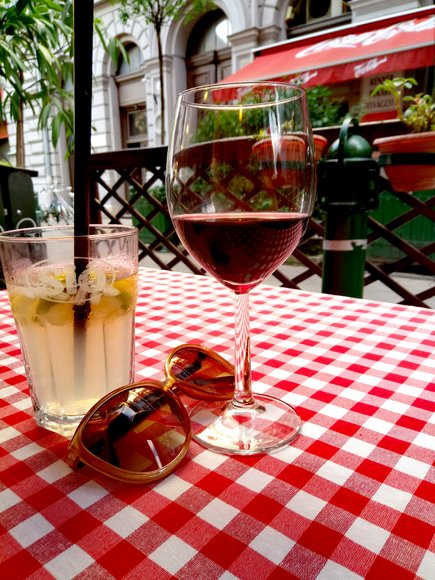 Отправились искать ресторанчик на Ráday utca 15, нашли, но столиков свободных не оказалось. Мужчина, сидевший за столом с дамой, увидев, что мы стоим в поисках столика, окликнул официанта и что-то сказал ему на венгерском языке, тут же нас усадили за столик, убрав табличку «зарезервировано», принесли меню. Мы сделали заказ, отметили начало знакомства с Будапештом вином. Надо сказать, что усаживал и принимал у нас заказ один официант, а приносил еду другой постарше и какой-то не такой радушный. Сначала я не обратила на это внимание, но потом этот официант, проходя мимо, задел меня и женщину, сидевшую за соседним столом. Так вот, перед той женщиной, разговаривавшей на венгерском, он извинился несколько раз, а передо мной ни разу, это было не очень приятно! Муж заказал суп халасле и ребрышки в меду, я баклажаны под сыром, дочь, как всегда, курицу с картофелем фри. Ждали мы не очень долго, еда вкусная, порции большие.