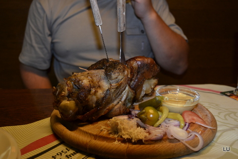 После Вышеграда решили двигать домой (в смысле в отель), ища где покушать. Недалеко от отеля нашли заведение, NA BREZANCE, прочитав меню перед входом. Внутри в курящем зале сидели колоритные местные жители с пивом (хороший признак). Официанты стояли около стойки и то же пили пиво. Прошли в зал для некурящих, на столике маленькое дневное меню. Подошел официант, попытался объясниться по английски, потом сказал «одну минуточку», подошел второй официант, немного говорящий на русском. Выяснилось, что то, большое меню, только после трех (время 14-40), но он узнает, если кухня готова, то все возможно. Ура, кухня была готова и мы сделали заказ. Да, первый официант, все-таки исхитрился принести нам пиво, в точку угадав, что мужу понравится нефильтрованное, ну а я заказала темное. Пиво просто класс! Все было очень вкусно, но уточки была четвертинка (о чем честно написано в меню, а в папиных ребрышках в меду и имбире были 2 куриные ножки). Под занавес мы попросили для дочки «гробики» прикольные пироженки, как обычно со взбитыми сливками (официанты опять пили пиво)