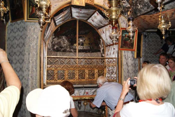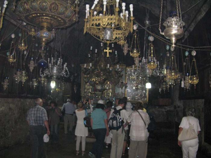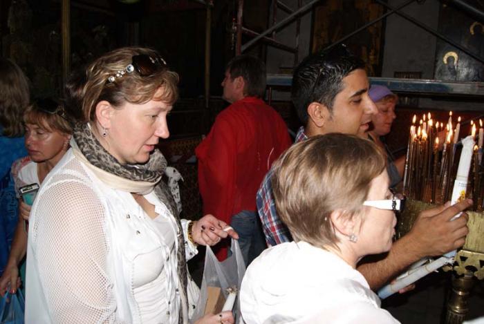 Чтобы пройти в храм, надо низко нагнуться и протиснуться через небольшой проход. Считается, что так мы смиряем перед входом свою гордыню. Мы попали в большой зал с колоннами, которые оказались под лесами на реставрации. В зале было очень много народа, все стояли в очереди к главному алтарю. Экскурсовод интересно рассказал нам о Храме и убежал договариваться, чтобы нас пропустили через «задний ход». Затем он увел первую группу, а остальных оставил ждать. Мы видели, как они пробирались, таясь. Честно говоря, как-то эта вся суета притупляла чувство присущее святому месту. Ждали мы очень долго. Потом он появился и повел нас сначала к алтарю. Вслед с осуждением на нас смотрели экскурсанты из очереди. Здесь, у алтаря, горит огонь, зажженный от Святого огня в Храме Гроба Господня. Мы опалили свечи, купленные в лавке.
