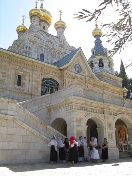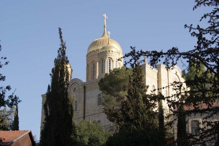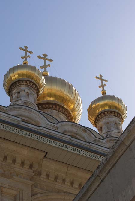 Маленькие золотые купола внизу – это наша следующая цель – русская православная церковь Святой Марии Магдалины, которую построил Александр III в 1888 году в память о своей матери.