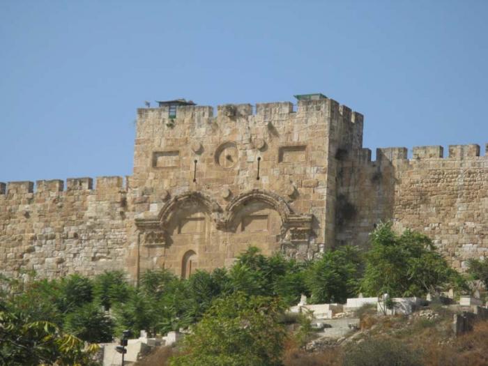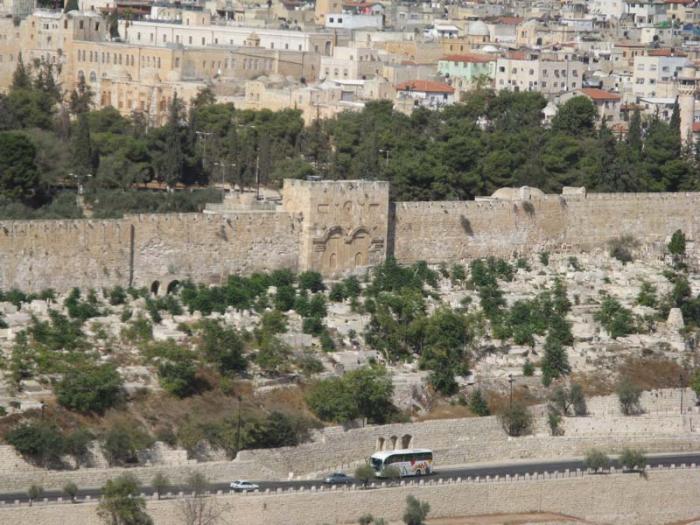 А прямо в городской стене – Золотые ворота. Именно через них по преданию должен въехать Мессия на белом коне. Чтобы этого не произошло, мусульманский султан приказал их замуровать, а перед ними разместить мусульманское кладбище, чтобы Мессия не смог проехать, не осквернившись.