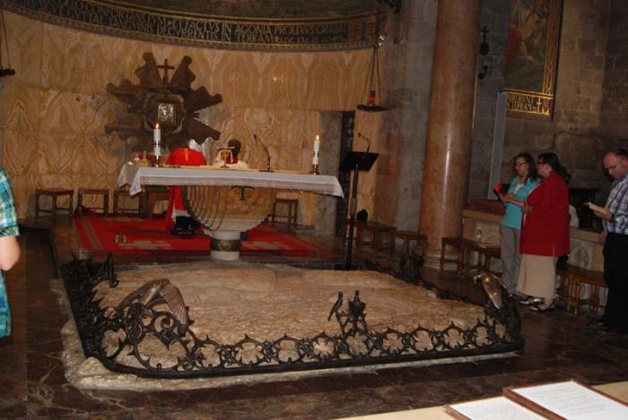 А перед алтарем расположен большой неровный камень, окруженный чугунным терновым венцом – именно здесь произошло предательство Иуды и арест Иисуса.