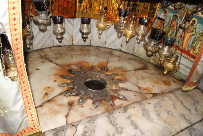 Прямо под алтарем находится Грот Рождества, где и родился Иисус. Местом Рождения обозначено серебряной звездой с 14 лучами. На ней мы освятили все иконы, свечи, которые купили в лавке. Но народа очень много, спокойно посмотреть, понять практически невозможно.
