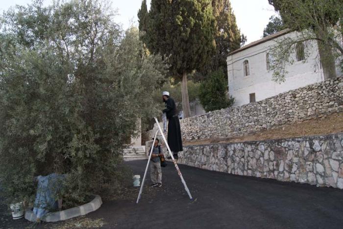 Сам сад с оливковыми деревьями, которым более 2000 лет, огорожен. В саду работали работники, обрабатывали деревья. Они незаметно, за деньги передавали обрезанные веточки с этих древних деревьев.