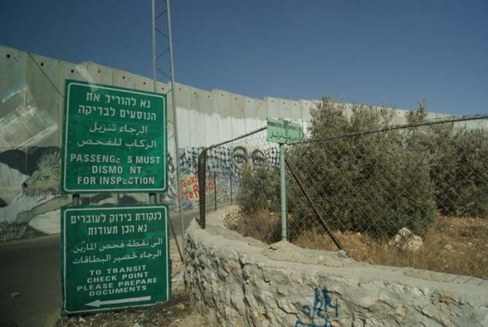 Выйдя из церкви, мы немного подождали наш микроавтобус и поехали в Вифлеем, который находится на палестинских территориях в 10 км от Иерусалима. Мы доехали до границы, которая обозначена довольно уродливой каменной стеной.