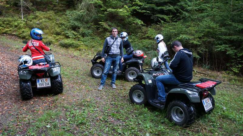 В связи с плохой погодой пляжный отдых пришлось отменить, поэтому развлекали себя как могли катанием на велосипедах и на квадроциклах. Чуть было не познакомились с австрийской полицией. Дело в том, что мы никак не могли найти нужную нам дорогу, которая должна была привести нас в горы, где мы и хотели покататься на квадриках. Нужно было проехать через одну деревушку, но куда бы мы там не сворачивали, все время упирались в чей-то дом или двор. Последним вариантом была дорога по полю (уже без урожая). Поехали, но перед нами оказалось болото. Развернулись, поехали обратно. Тут то нам и перегородил дорогу своим автомобилем бешеный австриец. Махал руками, кричал, что-то записывал на листочек, кому-то звонил. Короче, выяснили, что мы заехали на его поле. Хоть указателей о частной собственности нет, но все равно по полю на квадриках ездить нельзя! Он нас сфоткал (в шлемах!), записал номера и мы уехали. Высадив женскую половину у отеля, ребята повезли сдавать квадроциклы. Долго их не было …