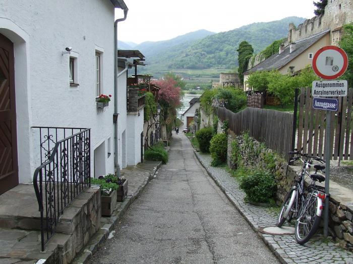 Дюрнштайн – это городок, где в средневековом замке находился в плену король Англии Ричард Львиное Сердце и где находится монастырь августинцев, основанный в начале XV века, жемчужиной архитектурного ансамбля которого является церковь Мари-Химмельфальт – символ города. Эта голубая церковь видна издалека отовсюду (внутри, кстати, выставки… ), а замок вообще нависает над городом, где бы ты не находился — он над тобой. Здесь полно сувенирных магазинчиков — и в каждом — абрикосовые алко-деликотесы и сопутствующие абрикосам сувениры… Но пьют в местных кафе все почему-то белое виноградное вино…