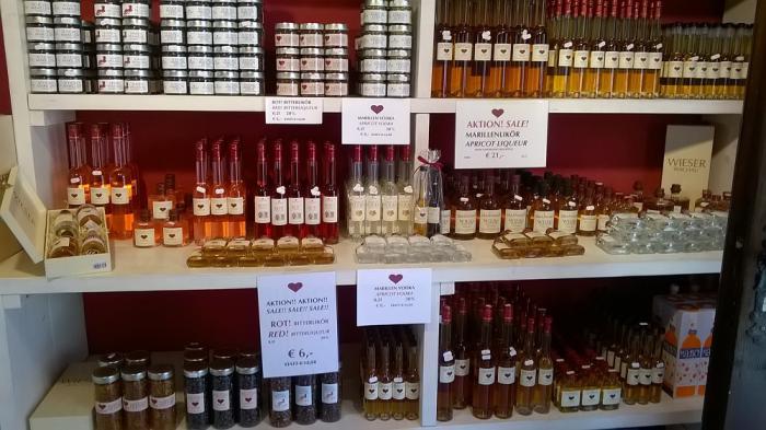 И плоды своих усилий местные фермеры умеют подать так, как нам учиться и учиться. С виноградом еще ладно, тут особая почва, климат – и понятно, что вино получается элитным — но абрикосы? У нас в Воронеже в саду у дома растут 4 абрикосовых дерева. Урожай мы весь даже не собираем. В лучшем случае я закрываю на зиму компоты и немного замораживаю размолотых с сахаром плодов. Их даже летом никто у нас почти не ест (простите, северяне, я знаю, как это звучит, но это так..). Но что из абрикосов можно делать такой великолепный ликер! А также десятки вариаций различных напитков (не считая уже абрикосовых мыла, гелей для душа и прочее, прочее). Респект австрийцам! Правда, на дегустации нектар с мякотью сильно напомнил размолотый абрикос, залитый водкой, но как красиво все это подано!..