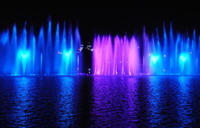 Вышли с территории завода уже в темноте и тут же попали на шоу поющих фонтанов. Они бьют прямо посреди озера и выдают свое представление под разнообразнейший аккомпанемент.