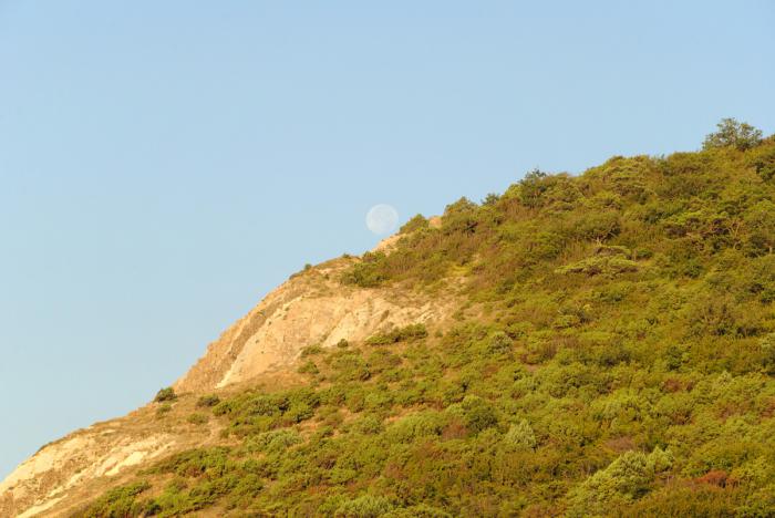 На краю обжитого берега удалось выяснить у очередного жаворонка, что пройти низом вдоль моря до пресного озера несомненно легче и быстрее. Потому полез в горы. И вот тут с каждым новым шагом стало приходить понимание, что вот она радость-то. Над горой впереди маячит белесая луна, за спиной уже пригревает солнце, но еще не обжигает.