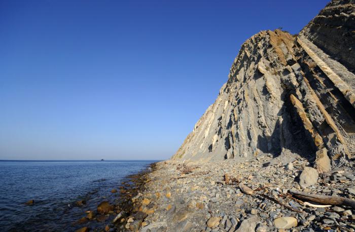 Чтобы разнообразить и ускорить путь я спустился к берегу. Вернее сказать, весьма экстремально съехал с этой верхотуры к воде по каменному желобу.