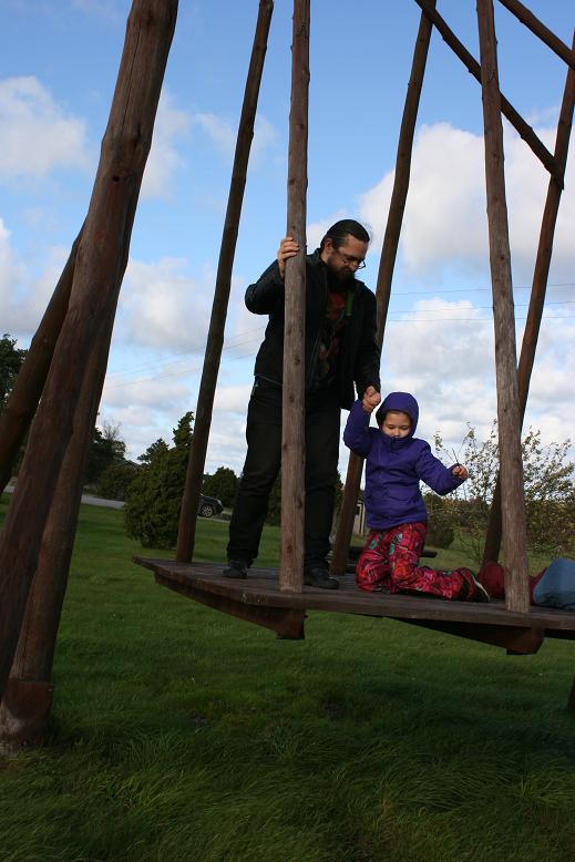 Столица острова Кярдла ничем особенным не запомнилась, только опять количеством яблок, посему едем обедать и ждать парома. Пока ждем, качаемся на огромных качелях, стоящих посреди поля! =)