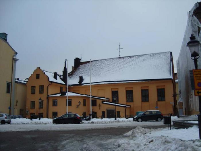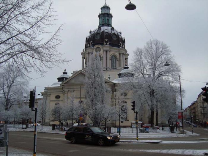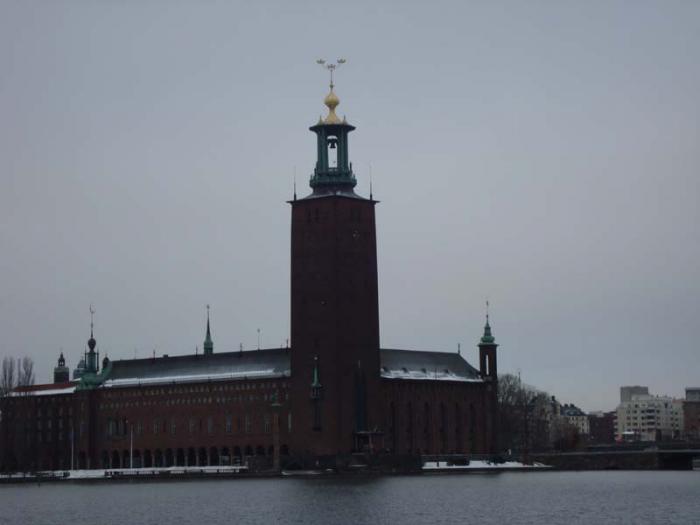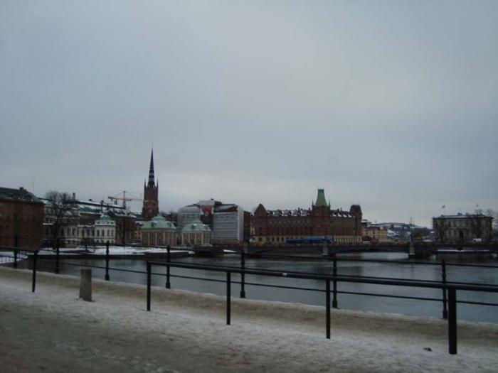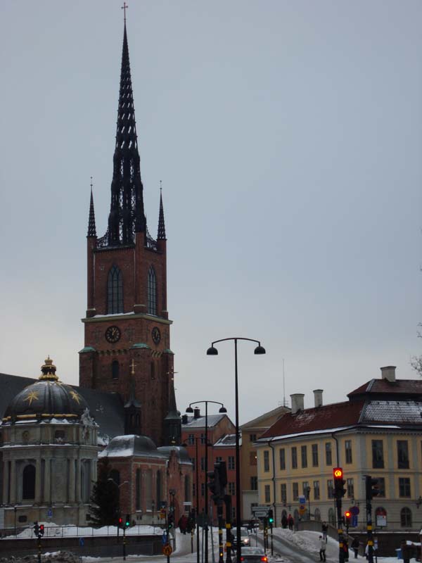 После развода караула обошли вокруг Королевского дворца и пошли на остров Риддархольмен (остров Кавалеров). На нем очень красивая церковь Риддархольмчюркан (церковь острова Кавалеров) с ажурным шпилем. Так же с этого острова открывается панорама на здание Ратуши.