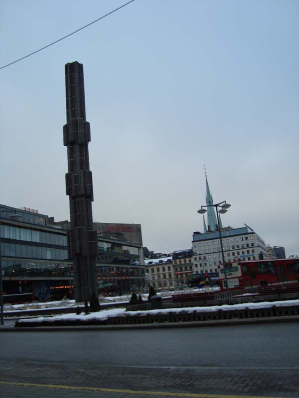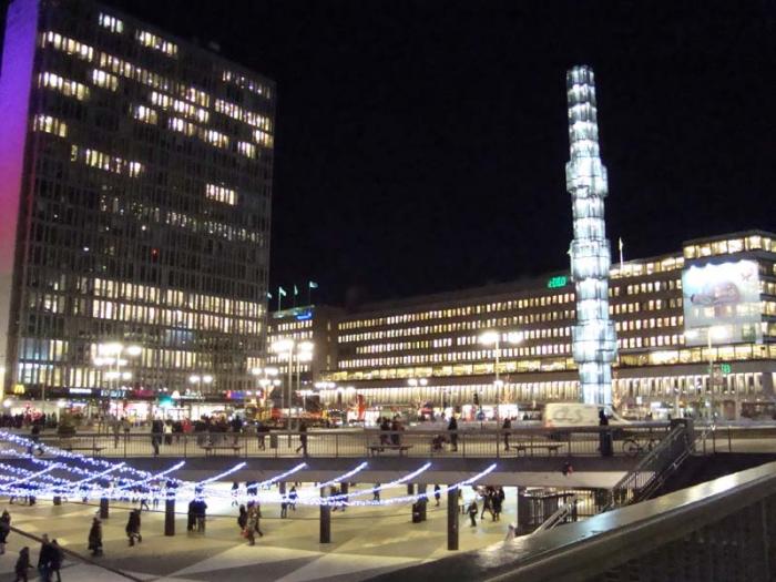 Из Гамла Стана прошли на центральную площадь Сергельторг. Вечером она смотрелась гораздо веселее, чем днем, особенно странная стелла в центре площади. Вечером она вся светилась и выглядела очень даже ничего.