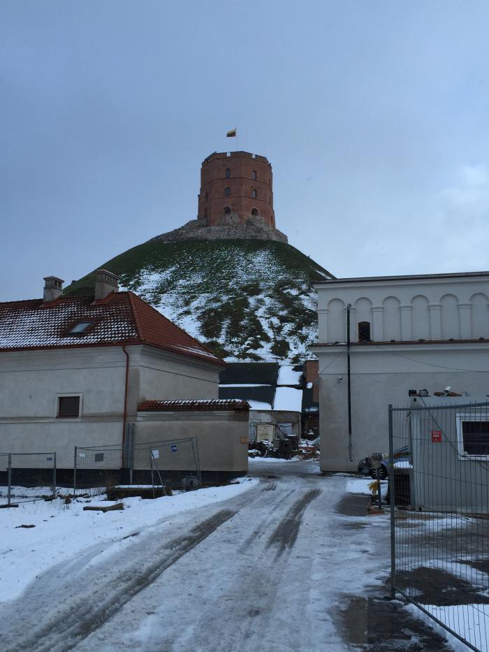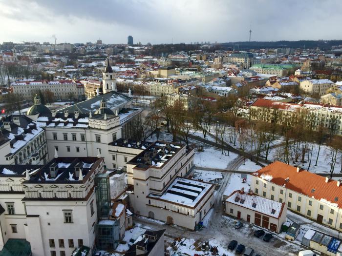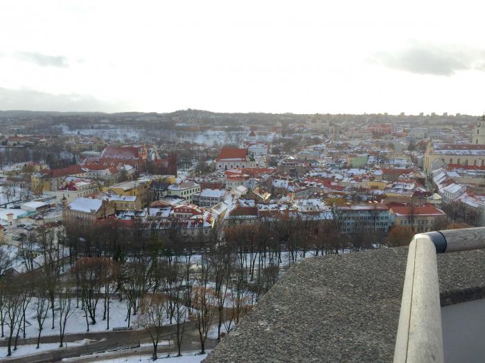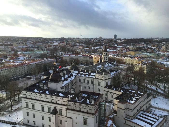 Начали осмотр с литовской гордости — Башни Гедемина. Наверх поднялись на стеклянном лифте. Какое все вокруг красивое! Внутри башни расположен музей, а на самом верху смотровая площадка, видно весь город. Супер! Оба были под впечатлением. Спускаться решили пешком, несмотря на небольшой гололед.