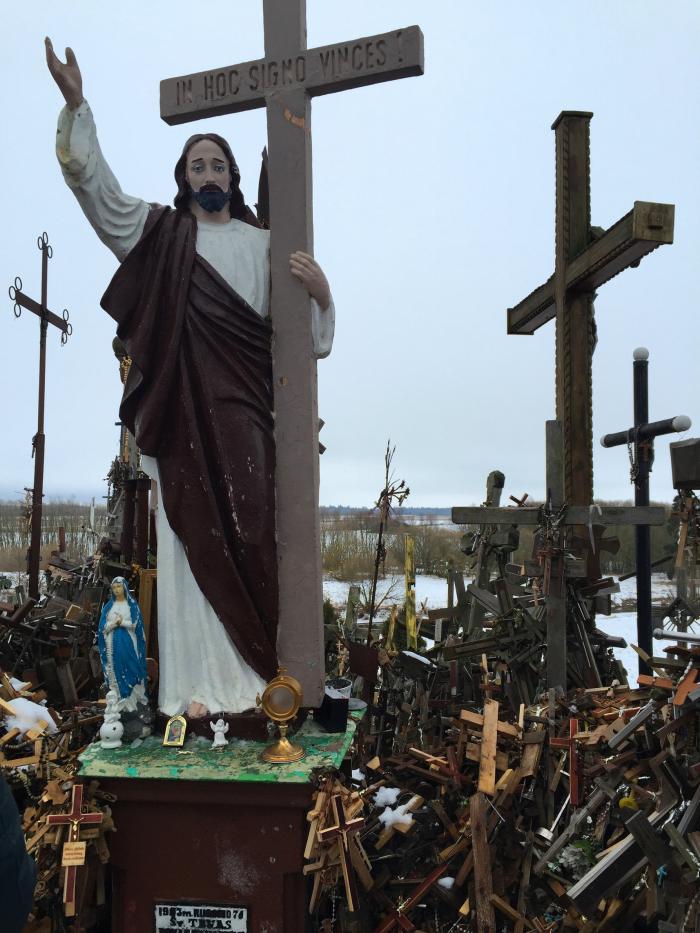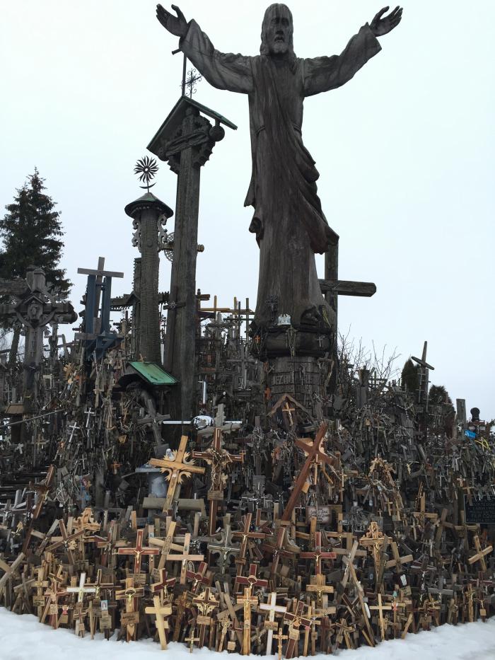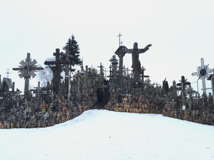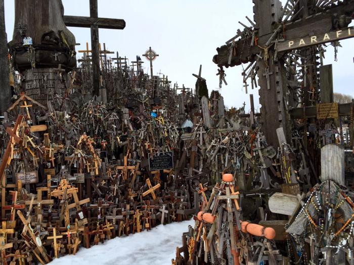 На сытый желудок дорога протекала веселее, и вот мы уже добрались до следующей достопримечательности. Гора крестов. Находится в г. Шауляй. Это место паломничества, отовсюду сюда приезжают люди, чтобы установить свой крест. Причем совсем неважно, какой ты религии, здесь кресты различных христианский конфессий и даже иудейский магендавид. Один из крестов установил папа Иоанн Павел II.