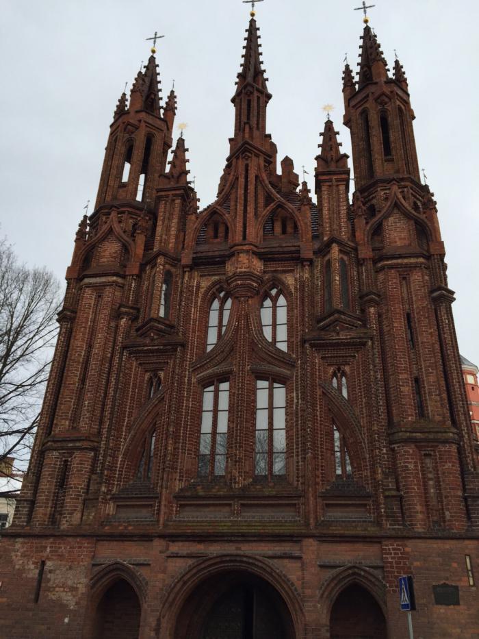 Вышли как раз к Костелу святой Анны. Выполнен в стиле готической культуры. Высоченный, длинной 22 метра, внутри находится орган, лавочки для прихожан, все как в другом католическом храме.