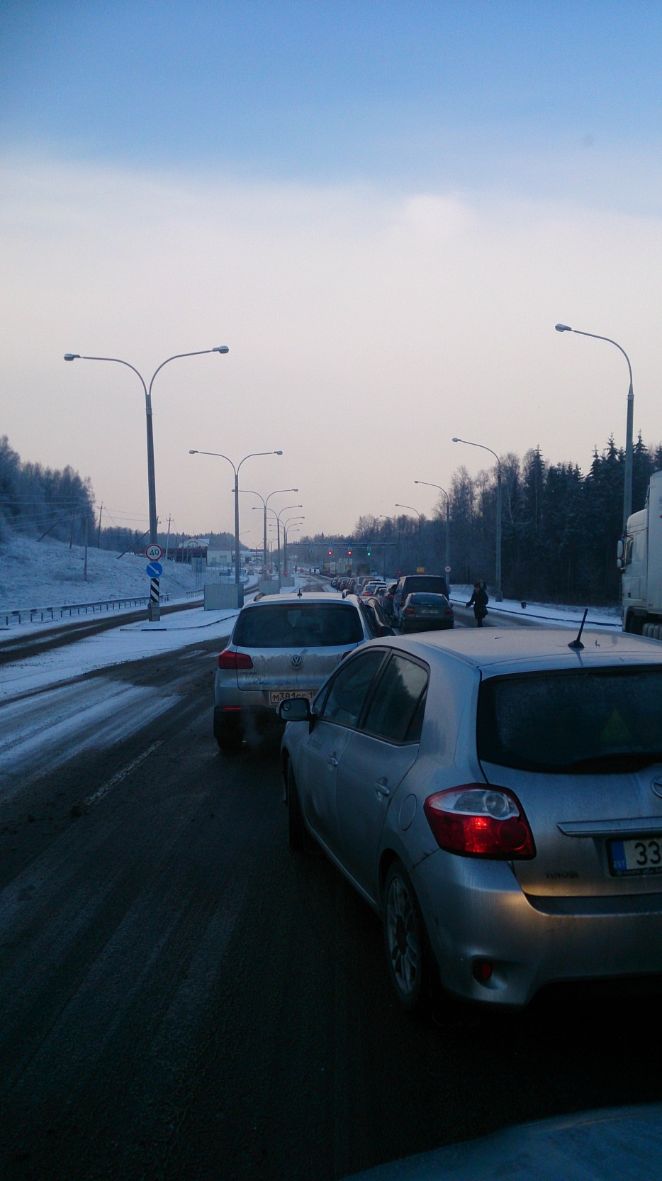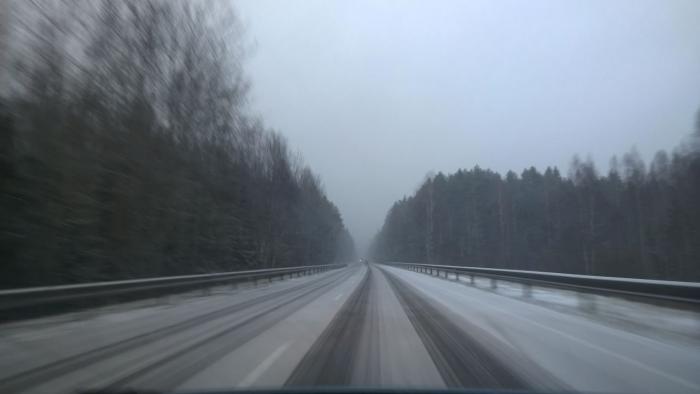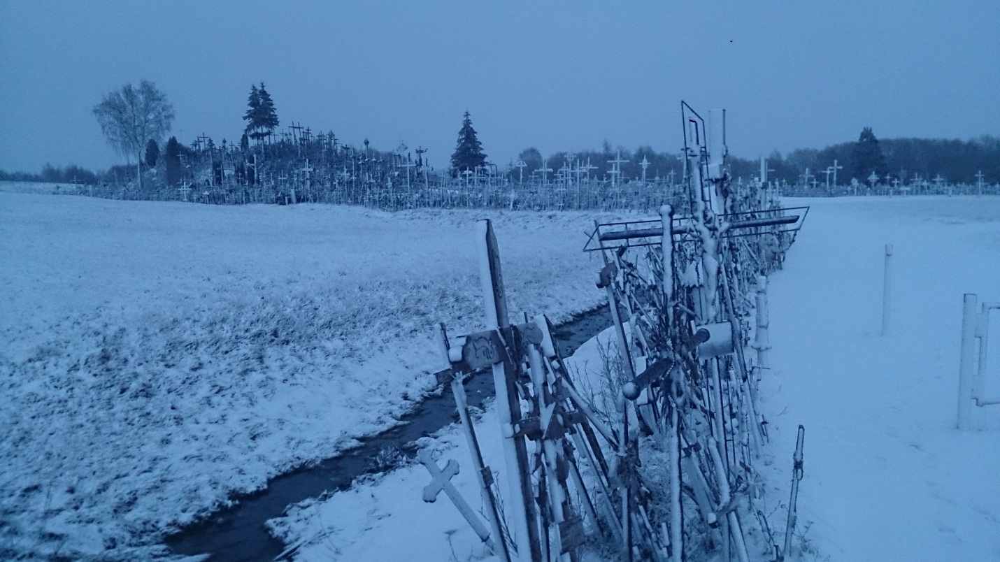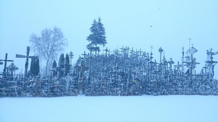 Погода испортилась. Постоянно шёл мокрый снег, дорога превратилась в кашу, где случайный выезд на сантиметр из колеи сопровождался заносом. Множество аварий, причём были очень серьёзные. Расстояние от Клайпеды до Горы Крестов около 190 км. Время в пути – 2 часа 10 минут.