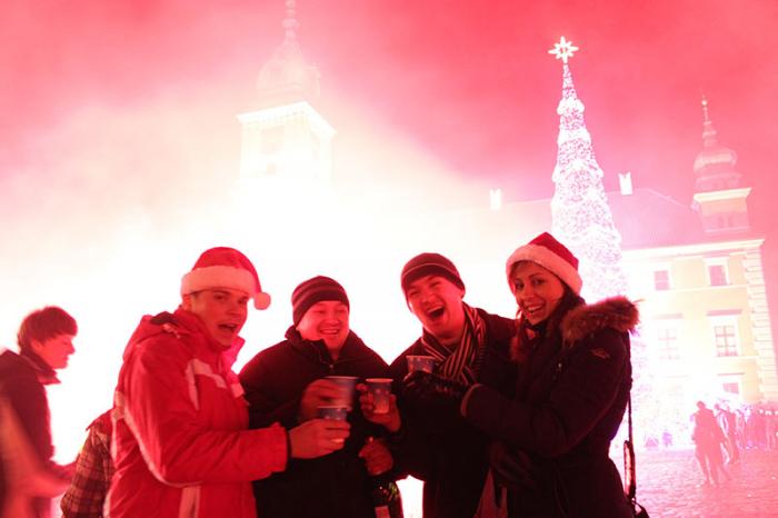 Новый год мы пришли встречать на Замковую площадь. Готовясь к поездке я читала возмущения наших соотечественников по поводу петард и фейерверков, но такого беспредела не ожидала. Начиная с половины двенадцатого и до половины первого, площадь превратилась в поле битвы. Взрывались петарды, запускались фейерверки, без каких либо мер безопасности. Иногда даже петарды специально пускались в людей.