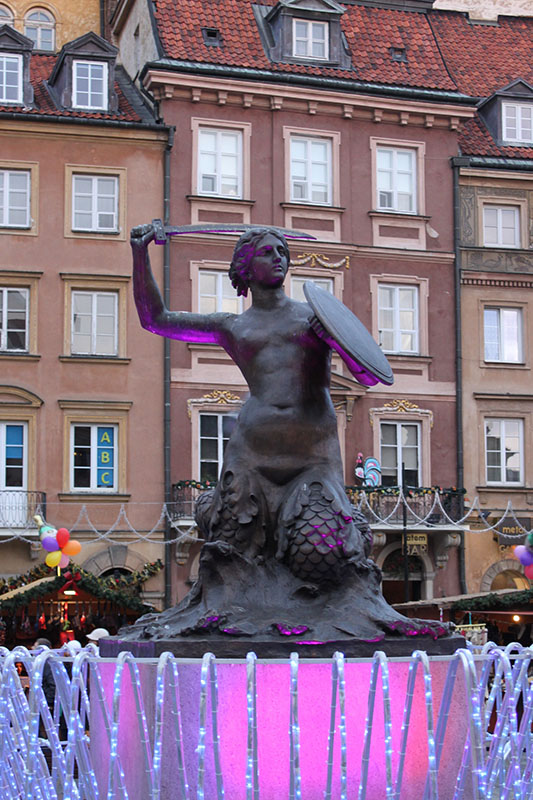 Русалка на Рыночной площади старого города. Русалка с мечом и щитом является символом Варшавы, её изображения можно увидеть по всему городу.