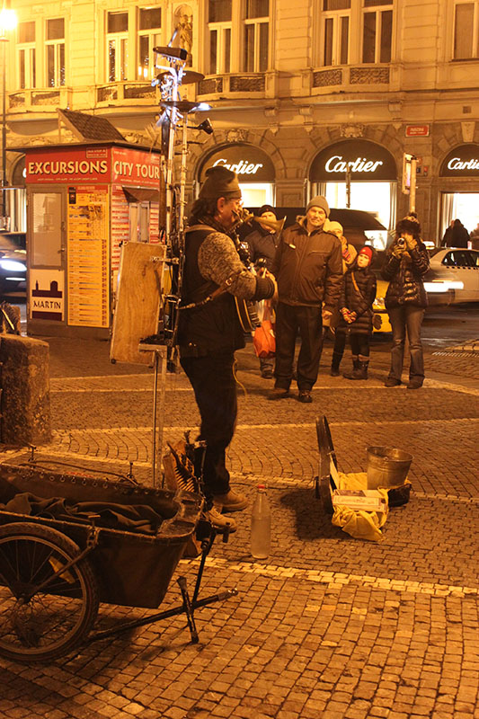 Гуляя по Староместской площади увидели забавного музыканта. Вернее забавным является его оборудование, при этом он создаёт прекрасную музыку и замечательно поёт. Голос похож на голоса со старых пластинок. Его стоит услышать!
