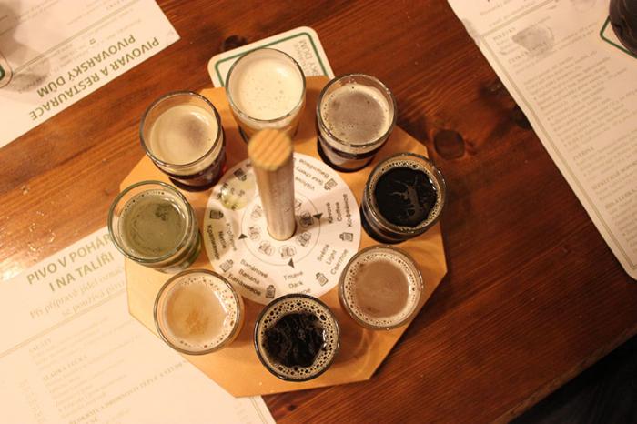 Для обеда наши друзья выбрали очередную пивоварню Pivovarsky Dum (Пивоварный Дом), расположенный по адресу Lipova 15. По дороге туда нам встретился танцующий дом – современно здание причудливой формы. Pivovarsky Dum — место очень популярное, особенно у туристов, что туда даже очереди выстраиваются. Большинство приходит туда попробовать пивную карусель – набор из восьми стопочек с различными сортами пива, которое варят в этом заведении.