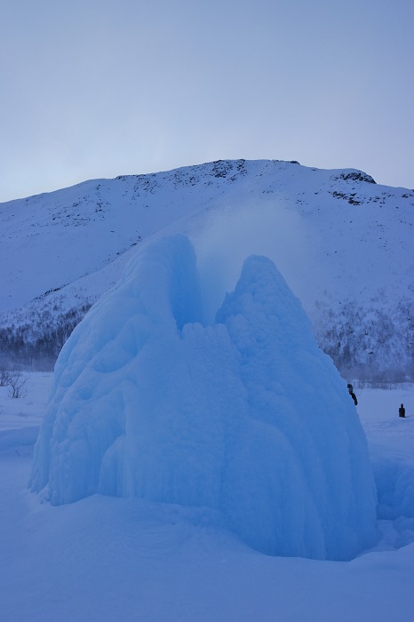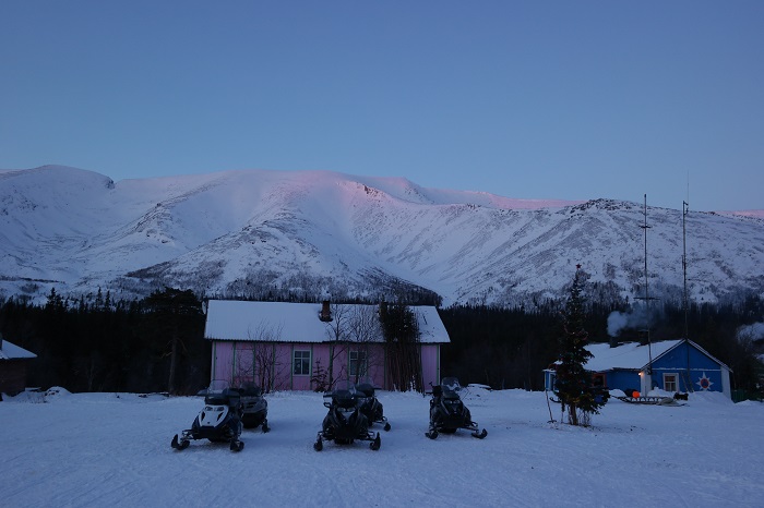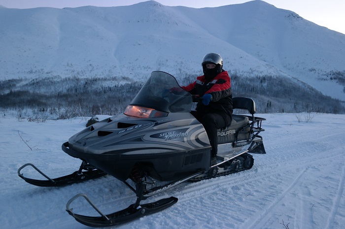 При бронировании снегоходного тура, сперва выбрал подъём на снегоходах на вершину горы Куэльпорр. Хорошо, что организаторы отказали в нём, предложив тур попроще. Я немного переоценивал свои возможности. Управлять снегоходом, оказывается, не так уж и просто. В общем, мы проехали примерно 45 км, колонной из 5 снегоходов, скорость 30-50 км/час. Останавливались для фотографий и заезжали погреться на базу спасателей МЧС. По времени 3 часа.